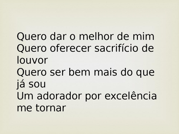 - Quero dar o melhor de mimQuero oferecer sacrifício de louvorQuero ser bem mais do que já souUm adorador por excelência me tornar