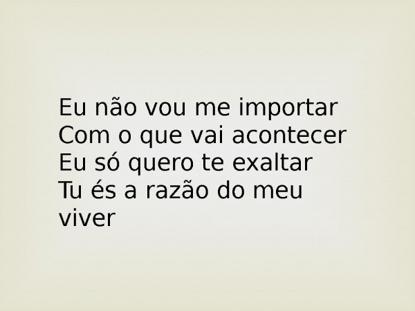 - Eu não vou me importarCom o que vai acontecerEu só quero te exaltarTu és a razão do meu viver