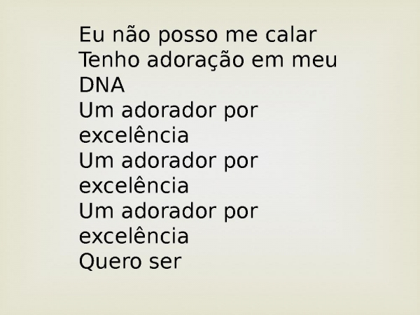 - Eu não posso me calarTenho adoração em meu DNAUm adorador por excelênciaUm adorador por excelênciaUm adorador por excelênciaQuero ser