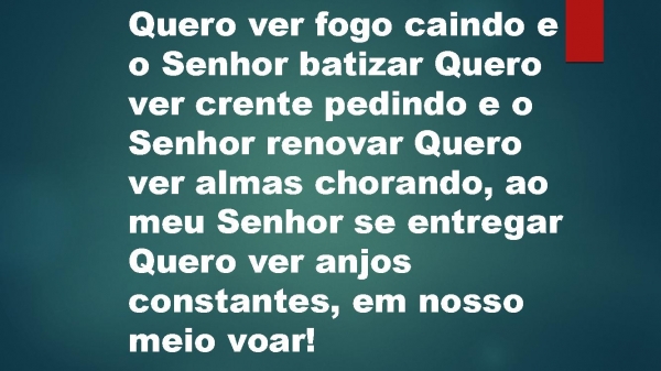 - Quero ver fogo caindo e o Senhor batizar Quero ver crente pedindo e o Senhor renovar Quero ver almas chorando, ao meu Senhor se entregar Quero ver anjos constantes, em nosso meio voar!