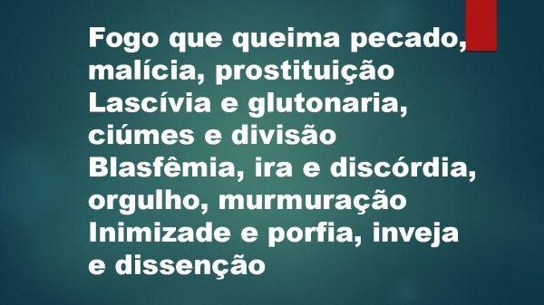 - Fogo que queima pecado, malícia, prostituição Lascívia e glutonaria, ciúmes e divisão Blasfêmia, ira e discórdia, orgulho, murmuração Inimizade e porfia, inveja e dissenção