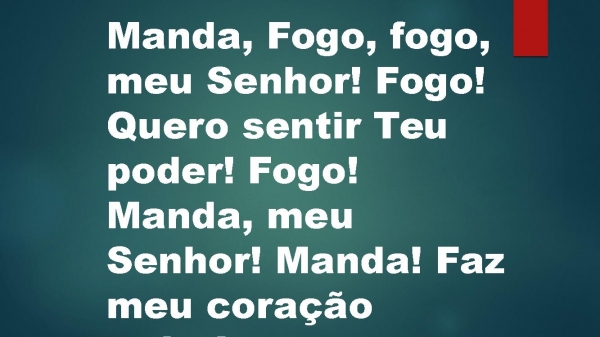 - Manda, Fogo, fogo, meu Senhor! Fogo! Quero sentir Teu poder! Fogo! Manda, meu Senhor! Manda! Faz meu coração arder!