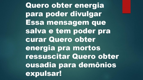 - Quero obter energia para poder divulgar Essa mensagem que salva e tem poder pra curar Quero obter energia pra mortos ressuscitar Quero obter ousadia para demônios expulsar!