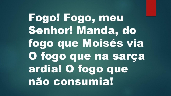 - Fogo! Fogo, meu Senhor! Manda, do fogo que Moisés via O fogo que na sarça ardia! O fogo que não consumia!