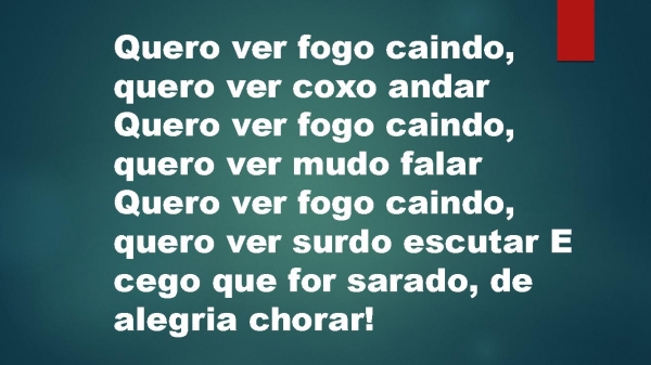 - Quero ver fogo caindo, quero ver coxo andar Quero ver fogo caindo, quero ver mudo falar Quero ver fogo caindo, quero ver surdo escutar E cego que for sarado, de alegria chorar!