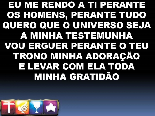 - EU ME RENDO A TI PERANTE OS HOMENS, PERANTE TUDOQUERO QUE O UNIVERSO SEJA A MINHA TESTEMUNHAVOU ERGUER PERANTE O TEU TRONO MINHA ADORAÇÃOE LEVAR COM ELA TODA MINHA GRATIDÃO