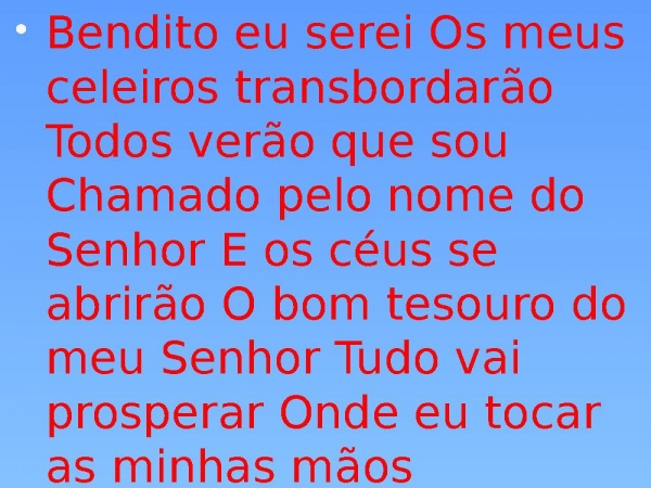 - Bendito eu serei Os meus celeiros transbordarão Todos verão que sou Chamado pelo nome do Senhor E os céus se abrirão O bom tesouro do meu Senhor Tudo vai prosperar Onde eu tocar as minhas mãos (3x)