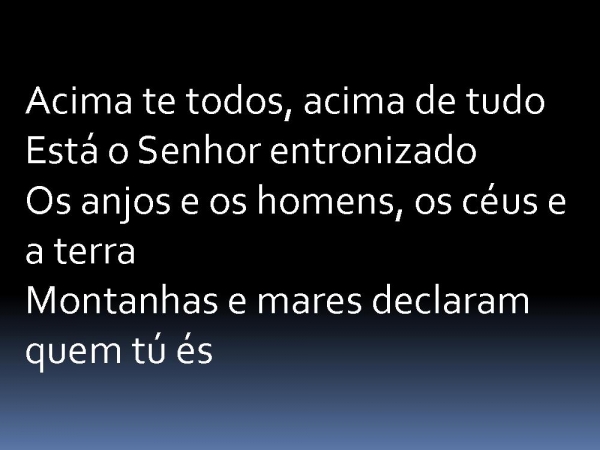 - Acima te todos, acima de tudo Está o Senhor entronizado Os anjos e os homens, os céus e a terraMontanhas e mares declaram quem tú és