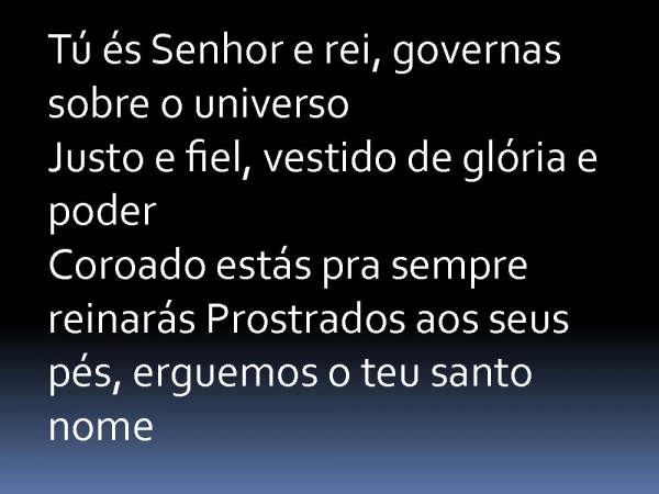 - Tú és Senhor e rei, governas sobre o universoJusto e fiel, vestido de glória e poder Coroado estás pra sempre reinarás Prostrados aos seus pés, erguemos o teu santo nome